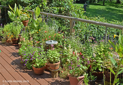 | While my vegetables are planted in neat rows, volunteer seedlings are filling in all the gaps. This photo was taken in mid-July so the salvia has not yet reached full size - it gets 'worse.' |